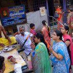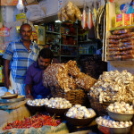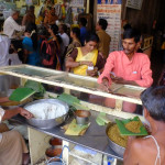 Puesto de venta de comidas, ofrendas y suvenires en el interior del templo Sri Ranganathaswamy en Trichy.