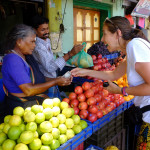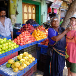 Posando con el matrimonio llevaba un puesto de venta de frutas en el mercado de alimentos del centro de Madurai.