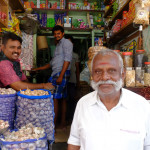 Tendero posando en la "puerta" de su tienda en la entrada del templo de Devarajaswami, en Kanchipuram.