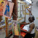 Comprando "moldes" para dibujar mandalas y figuras religiosas con polvo de colores... una manera fácil de imitar los dibujos que cada mañana realizan las mujeres de Tamil Nadu frente a sus casas.